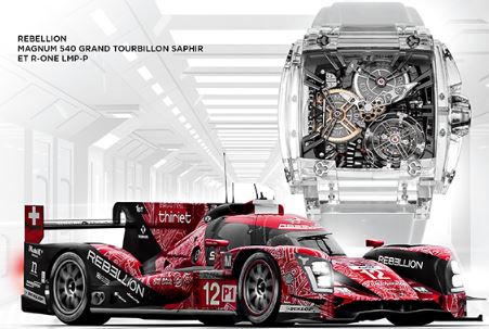 Ainsi, la voiture de course Rebellion R-One LMP1-P – vainqueur des mythiques 24 Heures du Mans en 2016, ainsi que de 6 trophées lors des FIA-World Endurance Championship – sera associée à un OVNI horloger, la Magnum 540 Grand Tourbillon Saphir. Sa boîte en saphir, la plus folle jamais réalisée jusqu’à présent, compte un travail de 47’600 minutes de fraisage diamant, soit 99 jours, pour parvenir à extraire les huit éléments qui constituent son boîtier de blocs de saphir taillés spécialement. Un pari hors du temps qui transcende la magie de la transparence et unique dans l’industrie de la haute-horlogerie suisse.